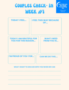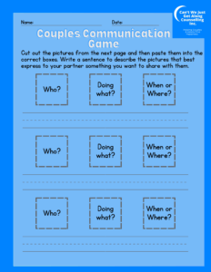 Download our couple’s communication game. Sometimes, couples struggle to express their feelings. Using this couple’s communication game is a fun way to try to express what’s important to you to your partner. Do it on a boring, rainy day or any day you feel like approaching your partner to have deeper conversations, but don’t quite know how.